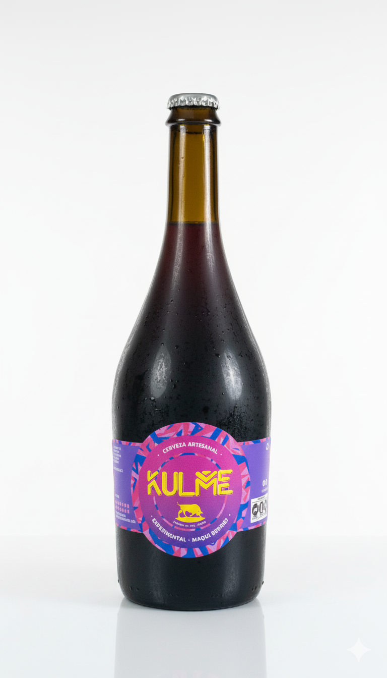 Kulme Experimental Maqui (5.0% ABV, 15 IBU) es una cerveza artesanal innovadora, elaborada con maqui, fruto nativo de Chile. Su atractivo color violeta y aromas frutales intensos la convierten en una experiencia refrescante y diferente, con equilibrio entre dulzor y acidez natural.